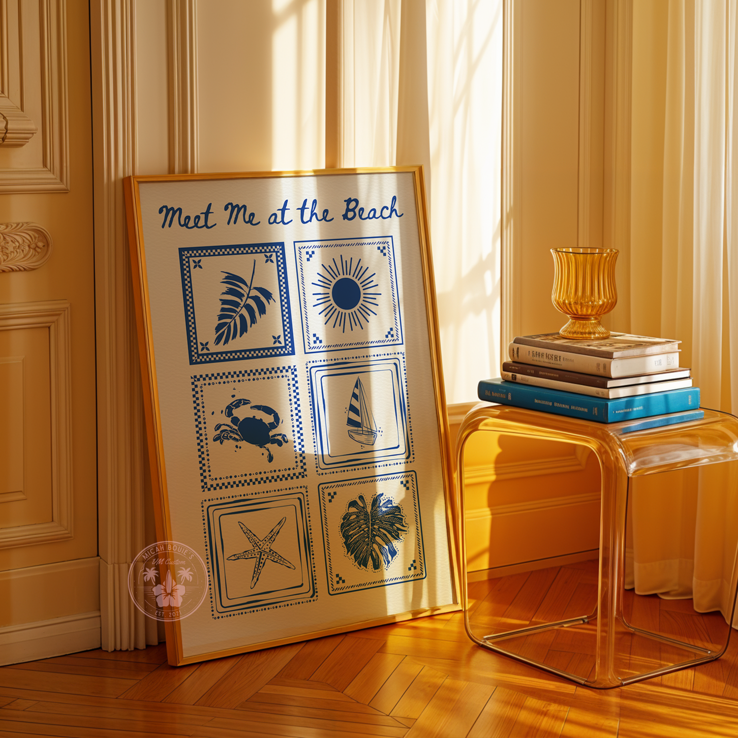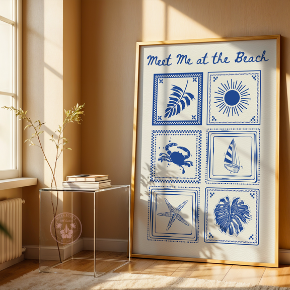 Bring breezy summer vibes into your space with this charming blue-and-white coastal poster! Featuring hand-drawn seaside icons like a sailboat, starfish, sun, and more, each tile invites you to relax and escape to the shore.